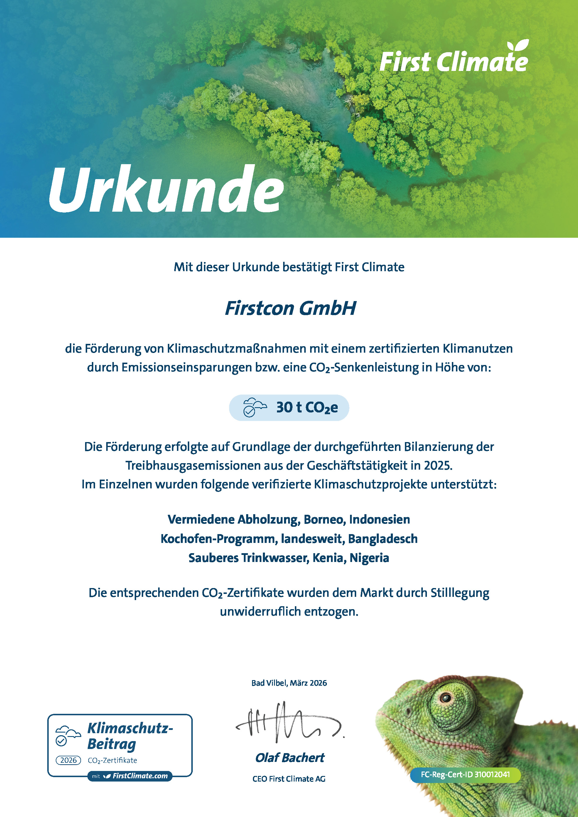 Jährlich werden alle Emissionen, die dennoch im Unternehmen entstehen, berechnet und durch Investitionen in zertifizierte Klimaschutzprojekte ausgeglichen.